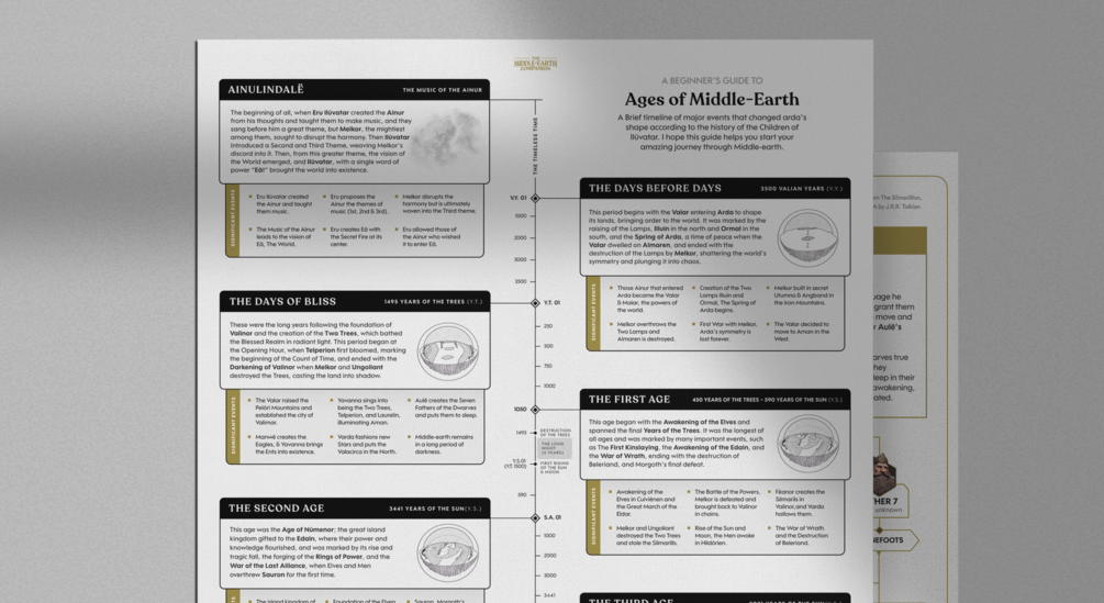 From the harmonious creation of the world to the downfall of Númenor and the rise of the Age of Men, this guide takes you through each era, highlighting the key events, cataclysms, and turning points that shaped Tolkien’s legendarium. Whether you’re new to the lore or just need a quick reference during your adventures, this downloadable (and printable!) guide is here to illuminate your journey.