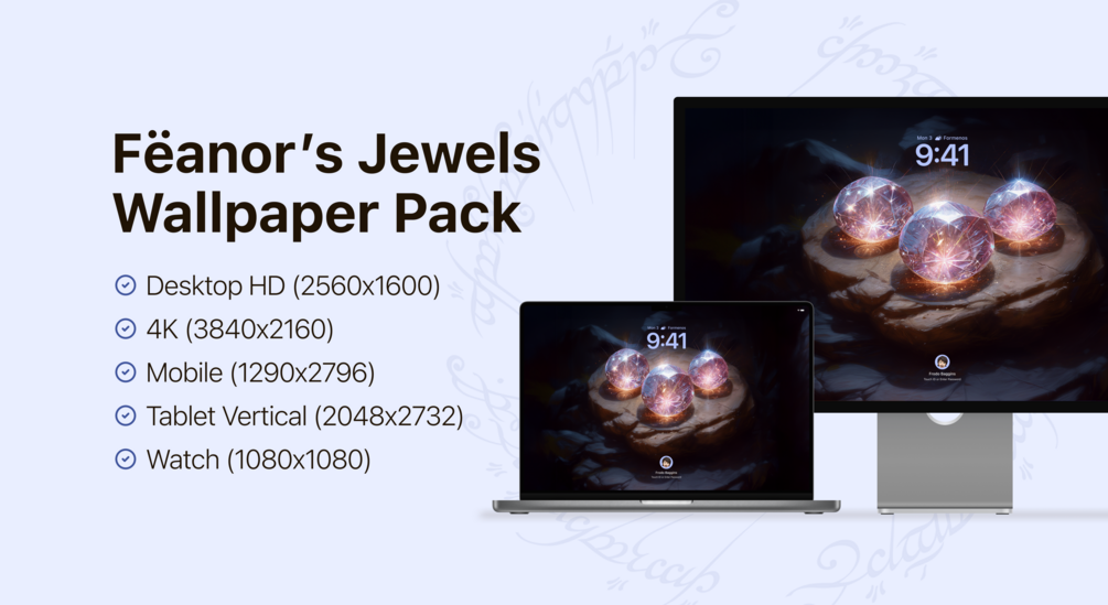Now you can enjoy the beauty and majesty of the Jewels of Fëanor with this incredible wallpaper pack. It features a stunning illustration of the Silmarils, transforming your device screen into an artifact of power.