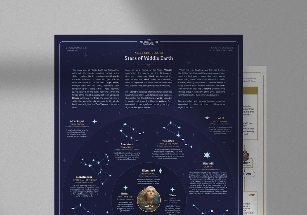 Take a journey to the skies of Middle-earth to know more about those beautiful, glimmering jewels that Varda put there for the coming of the Elves. As we know from the story, when the Elves awoke, they were greeted by the light of the stars, forever intertwining their fate with these shimmering marvels. Named "The Eldar" by Oromë, the Elves embraced their bond with the stars, cherishing them as an integral part of their identity and culture.